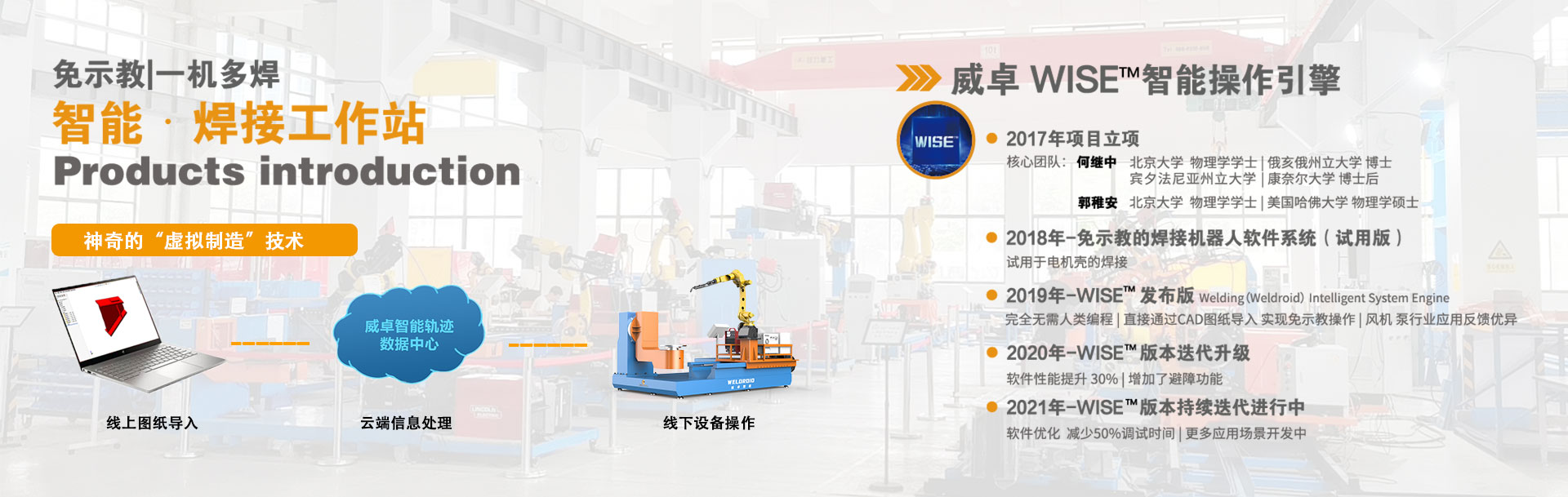 無錫威卓智能機(jī)器人有限公司成立于2017年,是無錫市政府引進(jìn)的科技領(lǐng)軍型高新技術(shù)企業(yè),公司研發(fā)團(tuán)隊(duì)80余人,我們堅(jiān)持自主創(chuàng)新,利用自主開發(fā)的虛擬制造技術(shù)對傳統(tǒng)焊接行業(yè)進(jìn)行升級(jí)改造。 公司主推的工業(yè)風(fēng)機(jī)系列-智能焊接工作站產(chǎn)品,具有免示教、實(shí)時(shí)跟蹤、簡易工裝、傻瓜式操作等優(yōu)點(diǎn),真正幫助企業(yè)解決了招焊工難,用工成本高,焊接質(zhì)量不穩(wěn)定等問題。